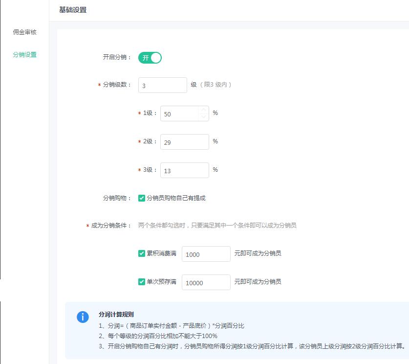 3、开启分销购物自己有分润时,分销员购物所得分润按1级分润百分比计算,该分销员上级分润按2级分润百分比计算。